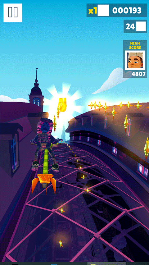 4、当然想要获得更高的分数,光靠奔跑收集金币是不够的,玩家可以通过购买滑板和双倍得分来帮助你获得更高的分数
