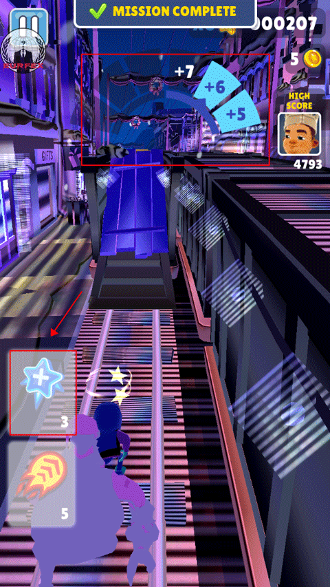 2、跳跃的距离也不是一成不变的。在上坡的路段,跳跃距离明显会短很多,下坡的路段, 跳跃距离又会长很多。所以,在这些地方躲避障碍物的时候一定要把握好起跳的距离。(PS:地铁跑酷基本上都是在平地上或者火车上,部分路段也会有起伏)