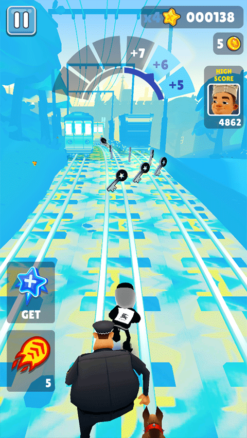 而在游戏中玩家们需要在地铁轨道上不断的奔跑,这里没有终点也没有时间限制,只有源源不断的障碍物和火车,以及追捕你的警察和狗。而且玩家奔跑的时间越长,到后面的速度也会越来越快,非常考验玩家们的手速和反应能力。但地铁跑酷游戏操作方式是简单的,只需要通过简单的向上划,向下划,向左向右划来躲避障碍和迎面而来的火车,很容易就能上手,适合各个年龄段的玩家!