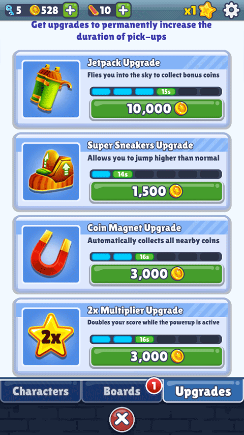 玩家们在游戏中会收集众多金币,可以利用这些金币到游戏商店中购买技能和道具,道具主要有加速、磁铁、滑板等。