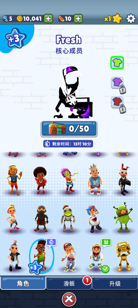 2、在游戏开始前,点击ME,玩家可选择角色、滑板、升级道具等;