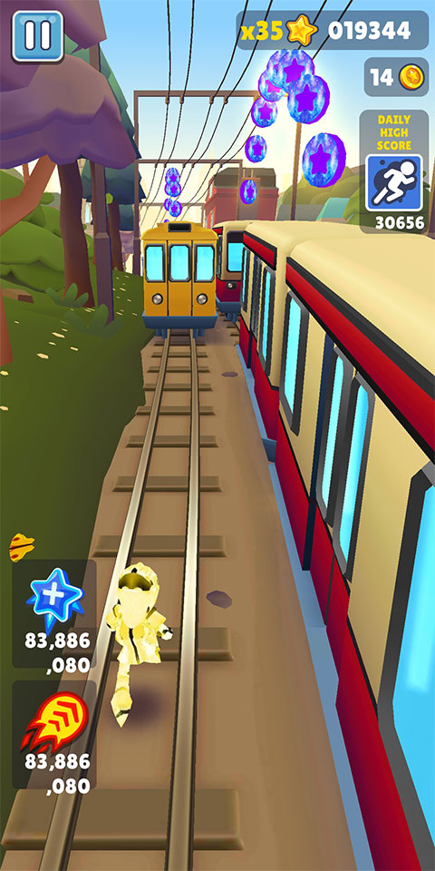 如果玩家想要获得金币则需要在赛道上进行拾取,尤其是在三条火车轨道上接金币时,最后一辆火车速度是最快的,此时玩家需要慎重拾取。另外在游戏中除了各种各样的障碍物让游戏充满了冒险感和挑战性外,还有在游戏过程中配有丰富的道具来帮助玩家顺利通过。这些道具能让玩家在游戏中操作更加非常流畅,大部分动作只需要左右滑动即可控制角色移动,有需要体验的玩家可以在本站下载畅玩。