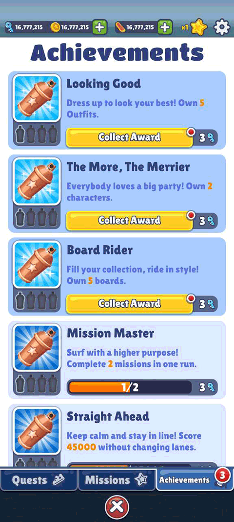 之后就是这个成就界面了,我们每完成一次它就会让我们领取一次奖励,这里面有很多成就,获得的奖励是游戏内非常稀缺的物品,钥匙。有了钥匙我们就可以去购买我们喜欢的角色以及滑板了。