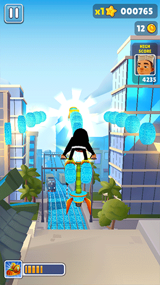 3、游戏中的滑板是唯一一款主动道具,通过双击屏幕使用,它可以帮助你增加更多得分,并且能抵挡一次撞击,在滑板选择界面还能选择不同功能的滑板,有滑翔、二段跳等。