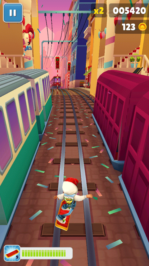 4、随机应变沉着应对,学会默数滑板的消失时间,以及优化跑酷路线(何时放开的捡道具、游戏币,何时选择安全路线为主)不要顾此失彼。