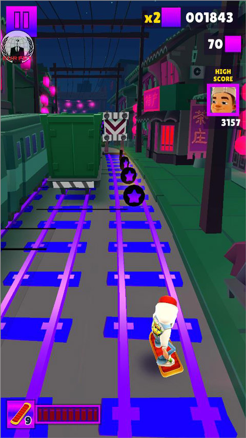 5、玩家双击屏幕可以启动滑板,滑板会持续一段时间,如果撞到火车或者障碍等都会被抓住,游戏结束。