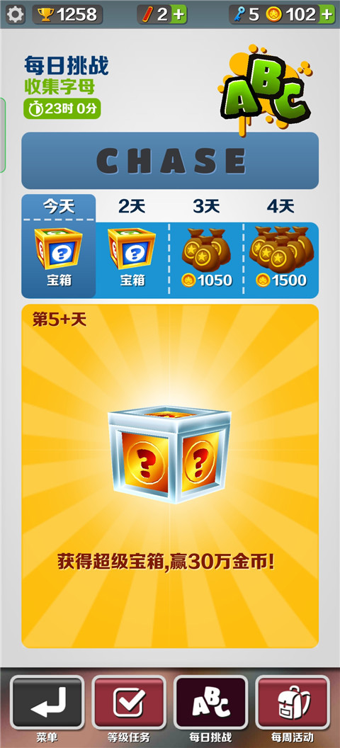 2、其次是每日挑战的任务,完成每日挑战即可以获得海量的金币,连续挑战5天可以获得超级宝箱,里面有30万金币可以获得