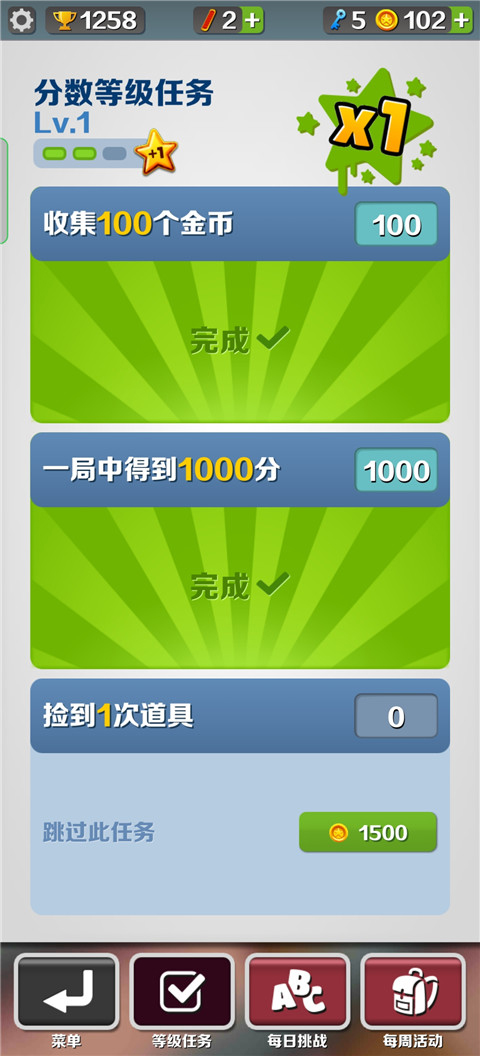 1、玩家进入游戏界面后先暂停游戏,然后进入任务中心页面,玩家们首先要完成等级任务,每个等级都有其相应的若干个子任务,完成即可获得对应的金币