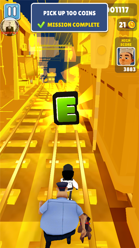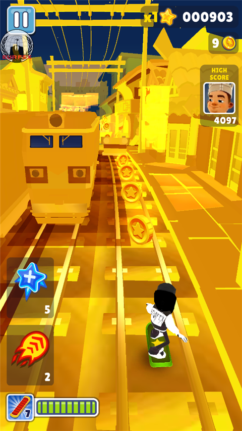 2、在列车上跑视野更开阔,往往比在地面上更安全,并且金币会指引你在列车之间跳跃。