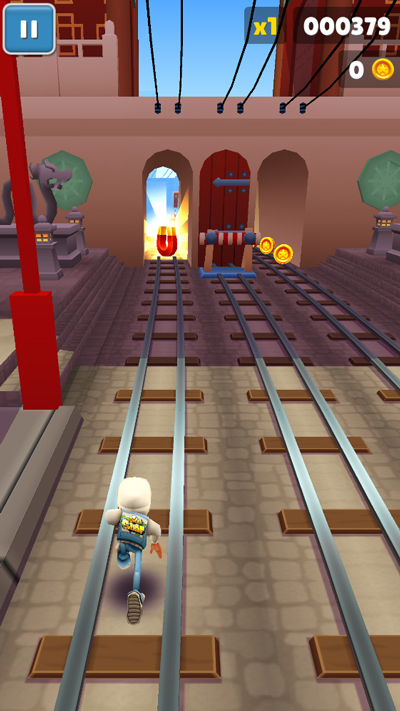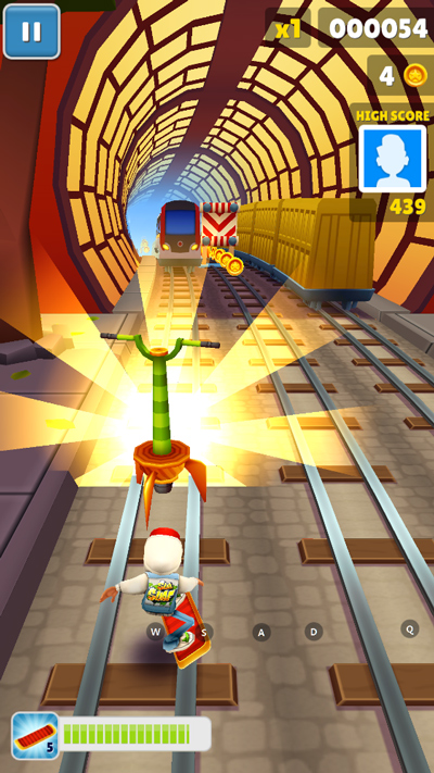 地铁跑酷中有磁铁、飞行背包、双倍得分、运动鞋、滑板等道具,其中滑板需要双击屏幕激活,可在商店中购买不同的样式,单次增加金币倍数及路程加速为单次使用,宝箱可在游戏中获得或在商店购买,其余道具则需在游戏过程中获得,并可在游戏内的商店中升级以延长有效时间。