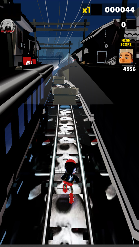 3、游戏的场景由经典的地铁场景变成了黑白像素的洛阳场景,并且随处可见贞子元素,我那家碰到障碍时,可以用手指滑动屏幕进行向下滑行、向上跳跃、左右转向等操作;