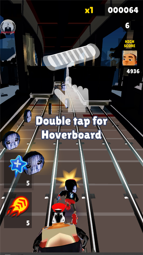 使用一次滑板,捡到5个磁铁,碰到4次栅栏不能被警察抓;