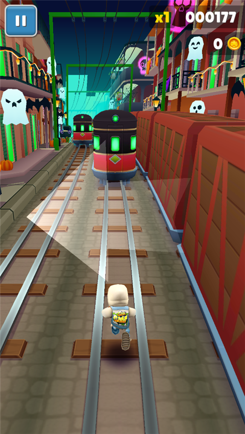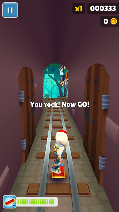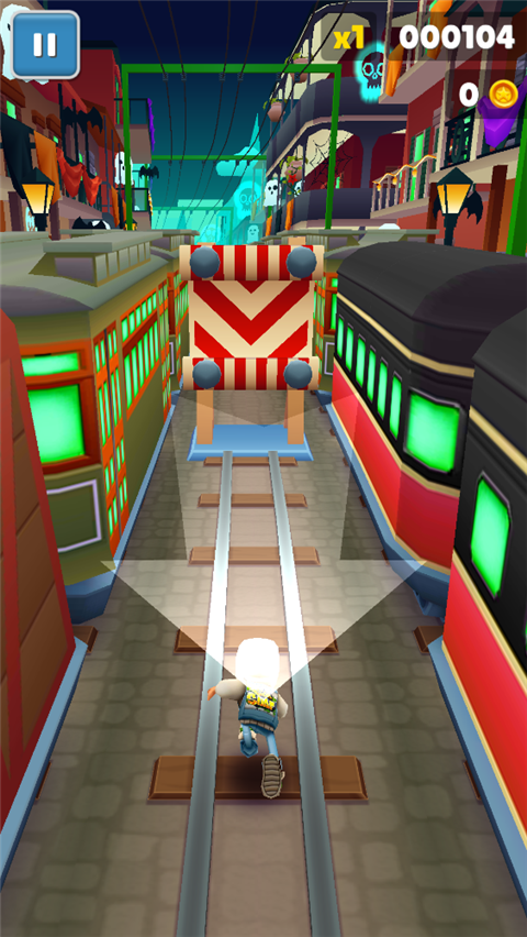 5、通过双击屏幕来启动滑板,滑板会持续一段时间。在没有滑板的情况下,角色撞到火车或者障碍等都会被抓住,游戏终结。但在有滑板的状态下,角色就有了一道保险,撞到火车等的时候,滑板会消失,游戏可以继续进行。
