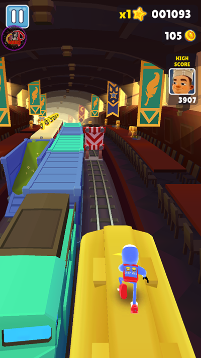 玩家经常遇到的一种情况。左右两路没有任何障碍,中路有5~6辆火车奔过来。为了能够把车上的金币吸收干净,这个时候就可以运用基础组合跳滚了,前提是不要玩得太很,稳一些较好,如果火车还没到达玩家下方,玩家就已经在半空中往下划那么就只有死翘翘了。