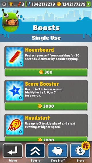 地铁跑酷滑板使用方法介绍,如果上面滑板数量显示是0时候,就不能使用滑板,必须需要用钱购买1个,购买好滑板后,1个滑板我们只能使用1次。