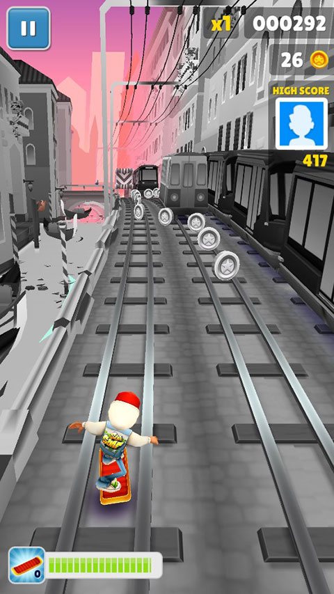地铁跑酷黑白情人节版本是一款整体色调为灰色的地铁跑酷版本,在该版本里玩家将在一片灰色的轨道上进行跑酷,保安和他的狗也是灰色的,只有我们自己和天空是有颜色的,整个跑酷过程很像是我们在追赶这个世界的最后的色彩,可以让玩家感受到不同于其他版本的游戏乐趣。