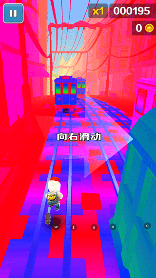 地铁跑酷彩虹世界的玩法和原版没有差别,在游戏里玩家需要操纵着角色在彩虹地图中逃离警察的追捕,游戏有多条道路可以进行跑动,但是在每一条道路上都有可能遇到不一样的障碍物,所以玩家在跑酷的过程中需要左右移动、上下跳跃来躲避障碍,在配合上翻滚就会得到更加高的分数,快来跑酷得到高分吧。