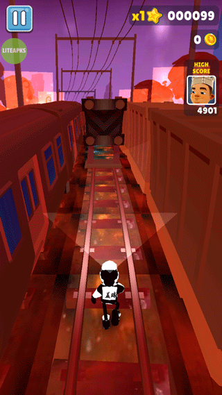 玩家经常遇到的一种情况。左右两路没有任何障碍,中路有5~6辆火车奔过来。为了能够把车上的金币吸收干净,这个时候就可以运用基础组合跳滚了,前提是不要玩得太浪,稳一些较好,如果火车还没到达玩家下方,玩家就已经在半空中往下划那么就只有死翘翘了。