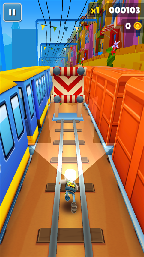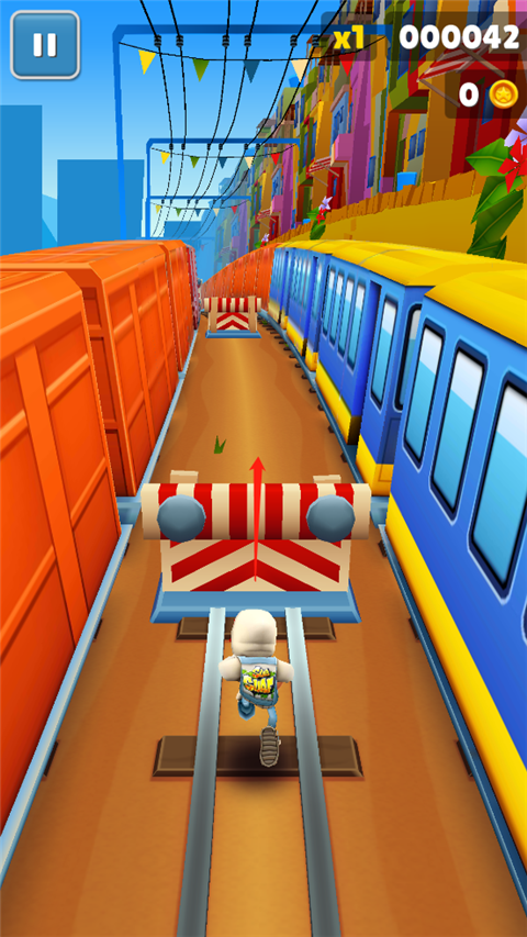 游戏的玩法有点类似于经典游戏地铁跑酷,游戏中玩家们需要使用虚拟按键来控制地铁跑酷中的人物;