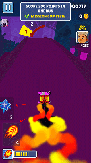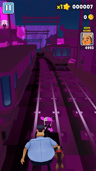 新手的话,操作很简单:向上滑跳过障碍物,向左滑翻到另一条轨道,躲避保安和火车的追捕。游戏里还有吸铁石、喷射器等道具,帮助玩家更好地完成冒险。如果不小心被抓或撞到地铁,游戏就会结束,显示你的得分。