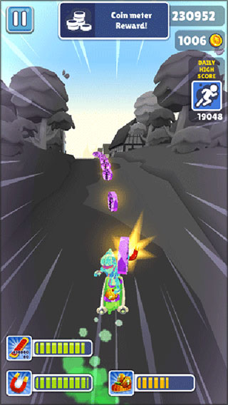 1、上跳。这可以让你跳过障碍物,在空中收集硬币, 有些非常高的金币,除非你有超强的运动鞋才能够到。