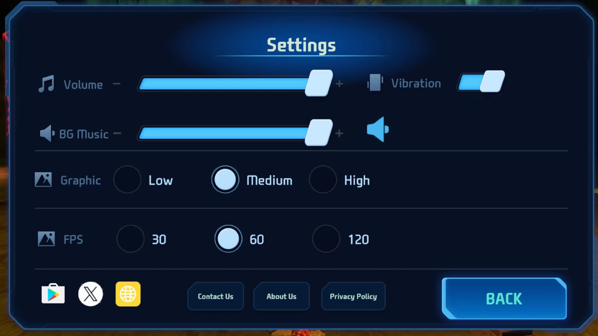 2、进入设置界面,可进行游戏音量、游戏音乐、画质和PFS等相关的设置,