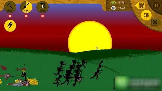 屏幕右上角有三个按钮,向左的箭头按钮点击后,我们的所有火柴人都会退守到基地后面, 当敌人来攻击的时候,只有弓箭手可以攻击到敌人,不过这也会造成我们基地的损耗。