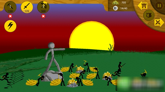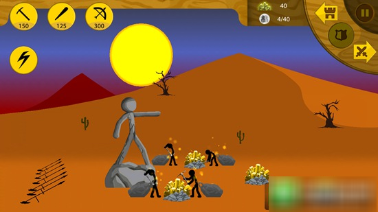 这是一款比较经典的对战塔防游戏,首先第一件事就是获取资源,我们点击屏幕左上角的“锄头”按钮,可以召唤出挖矿的火柴人,它们拖着大包来挖矿,然后我们可以获得更多的矿石召唤战斗类的火柴人。