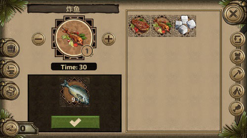 选择【工艺/制作】——【食物】,第一排的第二个就是炸鱼啦,一条生鱼可以制作一条炸鱼,烹饪时间为30秒,所以不要一次性烹饪太多鱼,尤其是饥饿值偏低的时候。