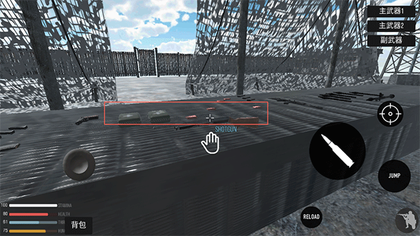 1、进到游戏后,在帐篷内的桌上可以看到有很多的枪和子弹,靠近出现手掌后点击即可拾取。