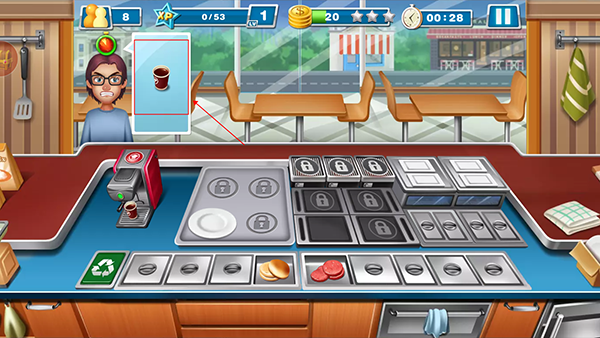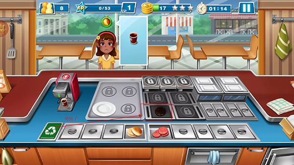 3、 进入到餐馆以后就会有顾客进来,顾客需要的食物会显示在其旁边的对话框中,我们需要做的就是制作相应的食物提供给顾客。