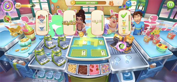 细心地玩家可能已经发现了,在文中的第一张图中,已经把糖给了顾客,所以,才能放肆的进行'连连上菜'!