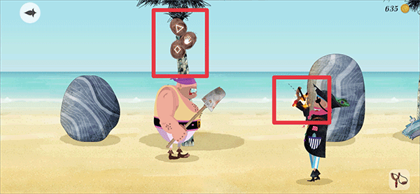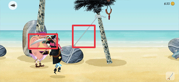 8、然后使用弹弓将另一棵椰子树上带有图形的三个椰子射击下来