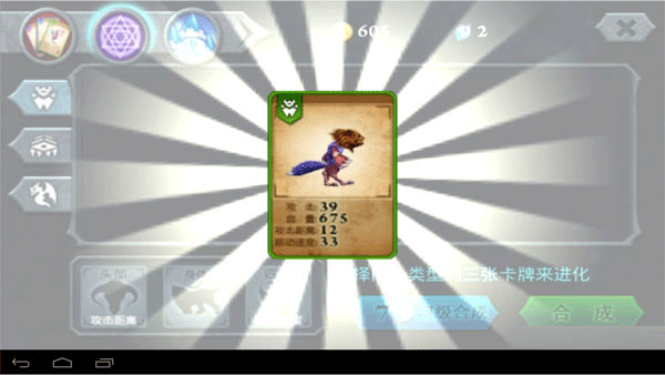 2、接着点击上面多面体紫球,进行合成,左边三个选项卡是三个属性分类,第一个是直立行走的动物,第二个是爬行动物,第三个是飞行动物,因为每次合成至少要三个动物,并且这三个动物必须属于同一种类型,所以我们先来合成老虎犀牛老虎。