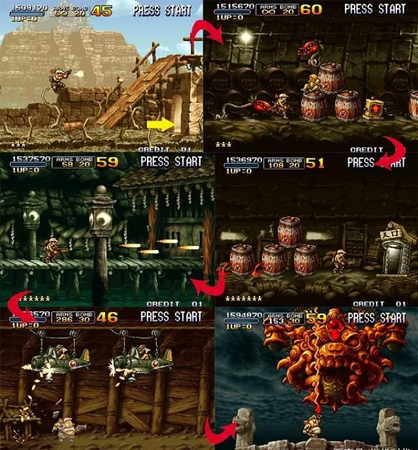 不知道大家注意到没有,其实在《合金弹头1》和《合金弹头2》中就已经有了隐藏的路线,只是不是那么明显,不会场景切换。