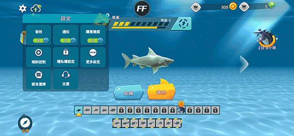3、采用触摸和重力感应两种操作方式,简单易上手。每条鲨鱼都有各自的任务需要你去完成,同时还有15个分布在地图各个角落的隐秘任务等你去发掘,玩家将通过完成成就获得极高的分数和额外金币!