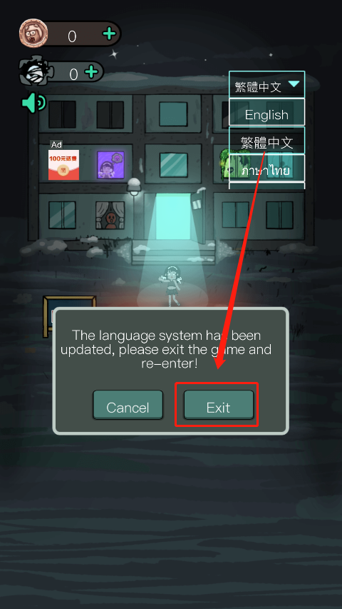 3、切换成功后会有下图所示提示,我们需要重启游戏改变语言替换效果,点击下图所示位置也快捷关闭游戏