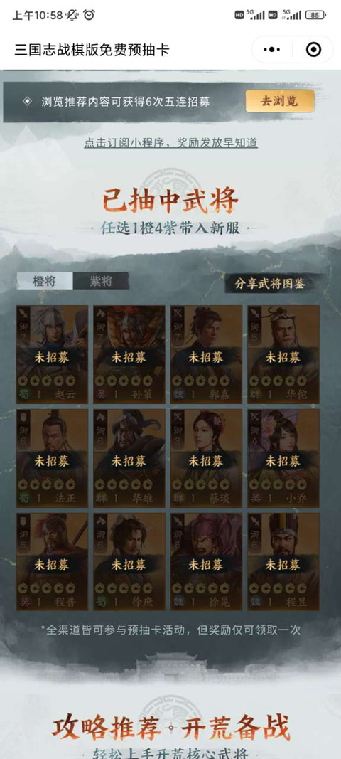 通过微信小程序或者公众号可以参与,每日在线抽卡获得橙卡和紫卡,可以在活动期间兑换,在游戏开测后即可获得对应武将。