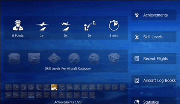 在成就系统中我们可以清晰的看到我们飞行的次数、时间以及飞行的总距离,这些数据对于我们来说是我们体验了游戏的见证,除开这些,还有一些我们在飞行途中达成的挑战也非常的有意思、例如无碰撞、第一次起飞,这些挑战都非常具有纪念意义,小伙伴们在体验游戏的可以顺手完成这些挑战。