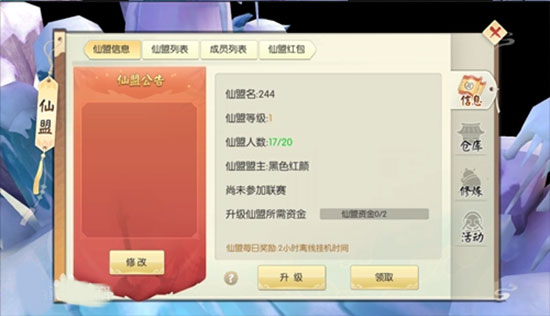 仙盟内成员可通过帮派任务、日常任务、帮派活动来增加仙盟资金,而仙盟资金可用于仙盟升级,仙盟升级后可增加仙盟人数上限;另外仙盟内成员可通过帮派任务获得兽粮,上交兽粮后盟主和副盟主可开启仙盟boss挑战。