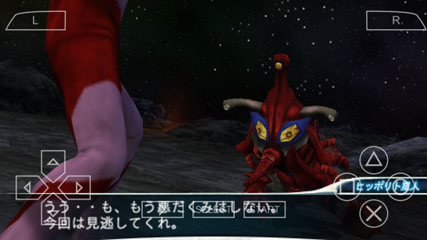 在神户港与帝国星人对战。开始后使用精神,同时帝国星人也会加能量。当四次精神用完后,就与之搏斗,大会因抵挡不住导致动作会减慢。这时你就可以猛揍他了,把他干掉,佐菲被救回。
