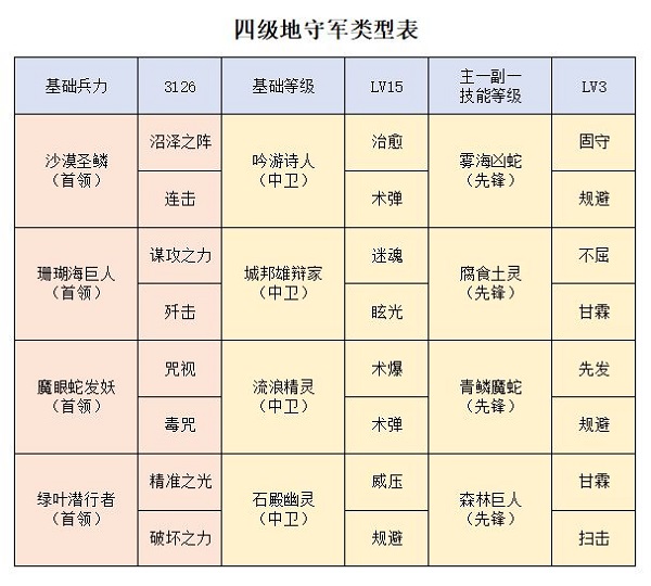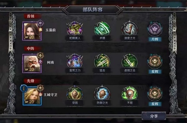 该阵容凑齐难度较低,可通过做主线、支线任务积累古代纸张,将英雄主技能升满之后,二三技能5级即可进行攻略,但这样的攻略方法是建立在等级、技能基础上的,且战损较高。