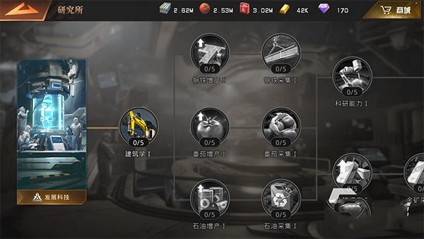在研究所里面,目前只有科技以及军事的发展两个选择,这两个选择的路线以及提升都是有很大区别的。先来介绍一下科技,科技的话里面包含的技能是相对较多的,不管是基础的建筑学还是高级的采集以及科研能力等,都是可以带来基地效率提升的。