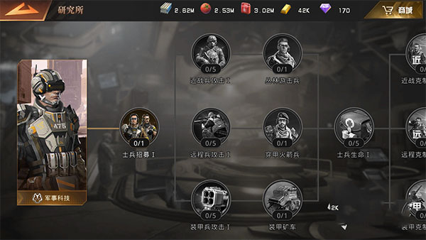 再来就是军事,军事方面的话简单来说就是解锁兵种以及提升士兵能力的。大家都知道在兵营里面最初只能够招募一种士兵的,而在研究所里面学习到技能之后,就可以招募到高级的战斗单位了。不同的兵种能力方面差异是很大的,利用好可以获得不错的战斗优势。