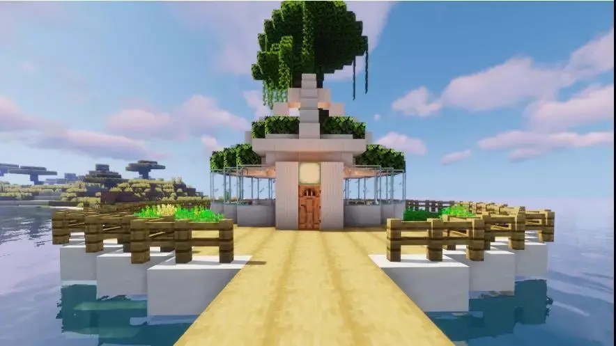 11、方便停船和钓鱼的码头:用去皮橡木原木往外延伸一个3x5的平台,平台下方用橡木栅栏向下延伸出简单的支柱,码头的最外侧贴上倒置的白桦木台阶