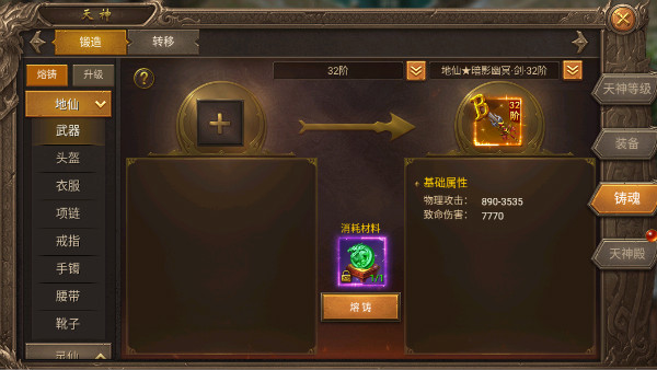 4、在熔铸页面,只需要一把32阶以上的青龙装备和对应的材料就可以熔铸天神装备了,材料可以在永恒战场和天神殿免费获得哦,当然如果你选择购买天神礼包的话,轻松不肝,一键收获,天神装备中地仙是神格属性的,灵仙开始才有神格属性,天仙装备以及以上装备集齐套装会有更强的装备技能哟;除了熔铸还有升级功能,你可以在升级页面升级天神装备对应的神格哦,当然如果我本来是35阶的装备现在获得38阶装备怎么办呢,要重新熔铸吗,不需要哦,使用转移功能就可以了,把你的天神装备属性转移到另一件装备上。这样就可以一键把38阶装备变为天神装备了。