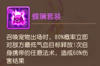 蝶斓的套装能让她在被召唤出场的当个回合,有着80%的几率对敌人气血最低的目标发动自身的法术技能。此法术可以触发法术连击和法术暴击,有了这个套装,蝶斓除了比其他法系召唤兽多了一个输出手段,因为针对气血最低的目标,还有一定的斩杀能力。