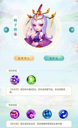 蝎子精:蝎子精的技能进阶为倒马毒桩,每次受到攻击有较高概率让攻击者中毒,若攻击者已经中毒,那么蝎子精能够减伤。