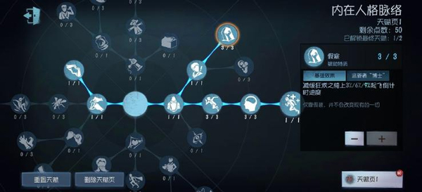 天赋可以看做角色的被动特质,能够增强角色的能力。玩家可以在推演日记的人格脉络里或者游戏准备时设置人格天赋。天赋并非固定的,玩家可以根据选择角色的不同而设置不同的天赋。求生者和监管者两种身份具有不同的天赋体系。每种身份的天赋都有4条天赋树,求生者天赋分为冷静、执着、友善、勇敢4条天赋树,监管者天赋分为强悍、警觉、威慑、狡诈4条天赋树。玩家相应身份的等级每提升1级,就可以获得1点天赋点;每积攒5点天赋点,可以点出1点天赋;每条天赋树的最末端为终极天赋,现版本共可获得120点人格等级,每张天赋页最多可点两点终极天赋。