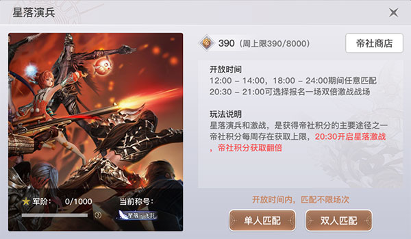 在没有参加星落激战的情况下,也可以使用天将令获得双倍帝社积分,天将令商城购买